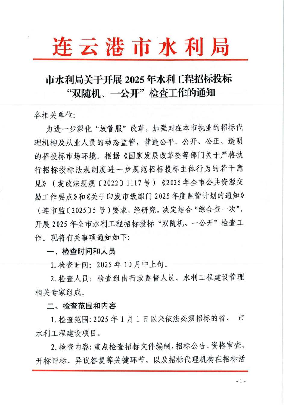 市水利局关于开展2025年水利工程招标投标“双随机、一公开”检查工作的通知