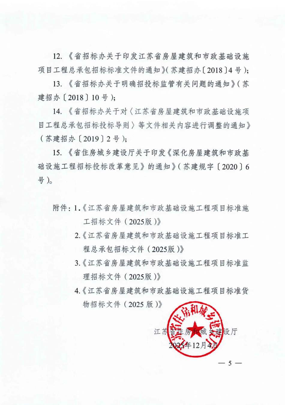 省住房城乡建设厅关于发布《江苏省房屋建筑和市政基础设施工程项目标准施工招标文件(2025版)》等标准招标文件的通知