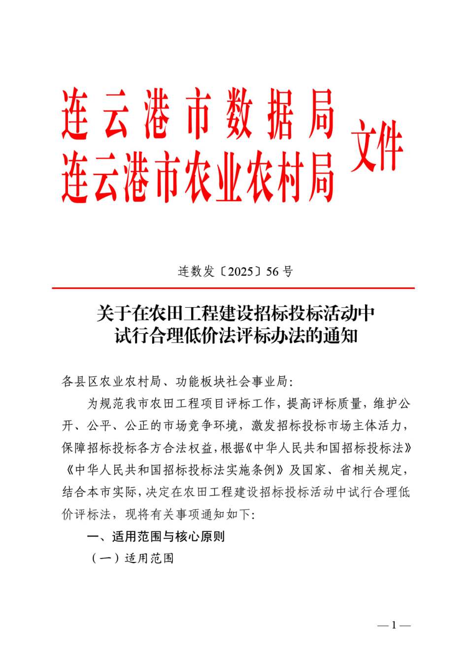 连数发〔2025〕56号关于在农田工程建设招标投标活动中试行合理低价法评标办法的通知.pdf