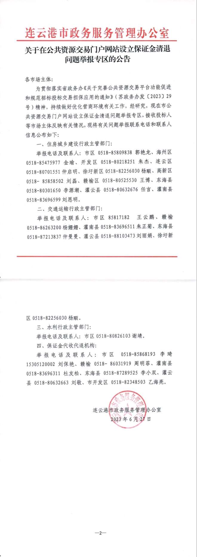 关于在公共资源交易门户网站设立保证金清退问题举报专区的公告