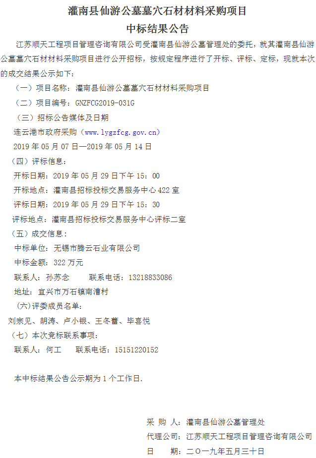 [中标公告]灌南县仙游公墓墓穴石材材料采购项目